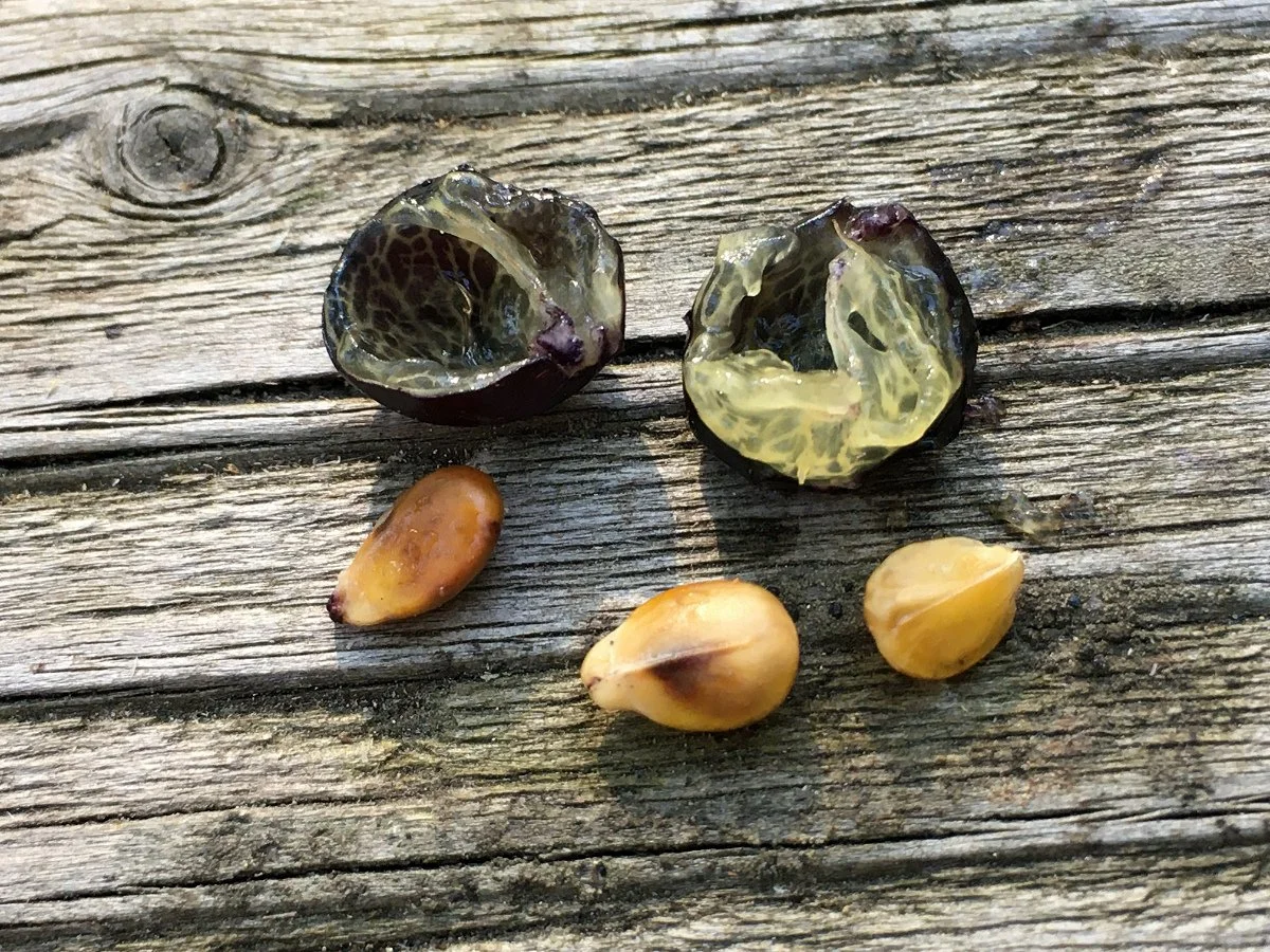 The fruit starts off green, turns to red, and then becomes dark black. They are round and a quarter to a half inch in diameter.