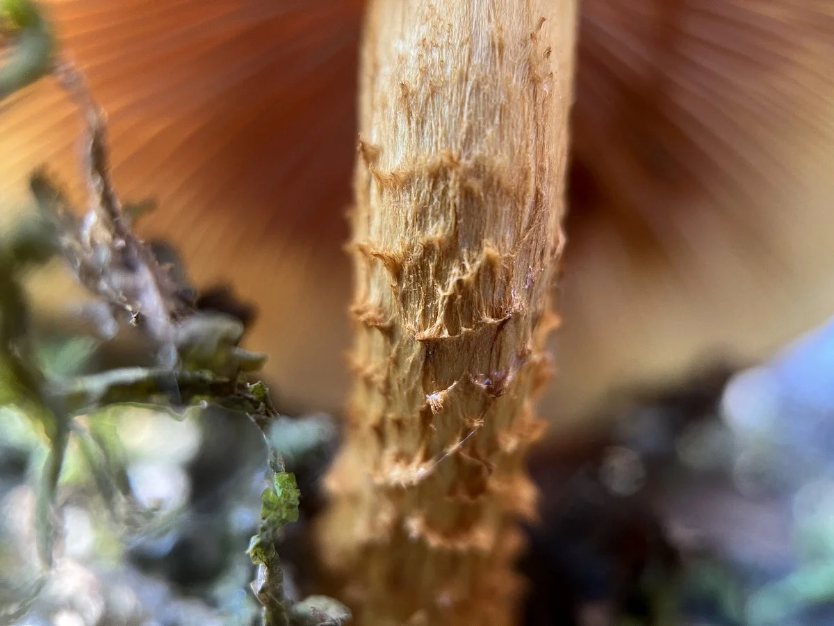 This mushroom is classified as a saprobe—a group of fungi that act as decomposers. They get their nutrients from feeding on dead and decaying wood, leaves, litter, and other organic matter. It was interesting to see them growing from the sturdy trunk of a live tree. I wondered if a mischievous forest gnome had glued the stalks to the side of the tree. Later, I read that some of the species of Pholiota grow on live trees. That said, farther up the tree on the end, it was damaged and decaying which maybe has worked its way down into the center of the tree where these mushrooms were emanating.