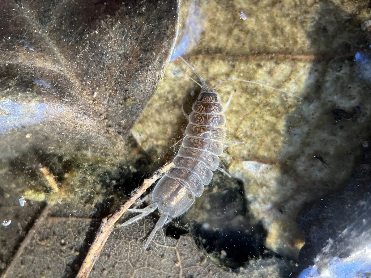 The water level in the wetlands dropped significantly in January due to the lack of rainfall. This made wading around surveying for amphibian egg masses easier. The shallow water also made observing other creatures inhabiting this ecosystem more accessible. I didn’t find amphibian egg masses in this area, but I came across this creature crawling around. When I first saw it, I thought it looked like a roly-poly. I gently nudged it with my finger to see if it would roll into a ball to protect itself. It briefly stopped to investigate my finger and then continued on its way. I watched it as it moved among the decaying leaves covering the bottom of the pool. I gently turned over leaves and found more of them. The sun came out and reached through the leafless, winter canopy. It illuminated this small pool revealing a beautiful pattern and color across this animal’s body. I loved the stillness of the water and the textures and colors of the underwater landscape. It was peaceful watching this animal shuffle about in its home.