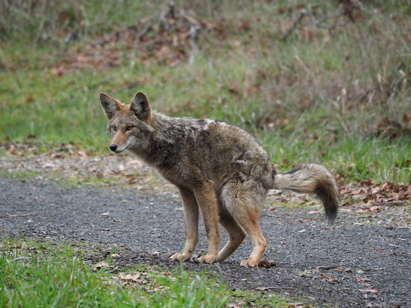 This coyote has been hanging around the entrance to the arboretum for a while this winter, which I have seen individuals do in years past at this time of year. Usually it keeps its distance as it hunts and roams around the open, grassy areas, but this year this one has become a bit more comfortable with people. A few people have reported to me that they have seen people feeding it in the parking lot, but I have not witnessed it myself. That might help explain why it has been seen more frequently in and around the parking lot. Please do not feed any animals at the arboretum. This day, I was photographing some lichen on an oak branch, when I looked over to see that it had snuck up on me. It was watching me and inquisitively sniffing the air. It then slowly trotted a little ways up the gravel road leading to the administrative building, stopped, and defecated on the road—a bold statement indeed. What is it saying?