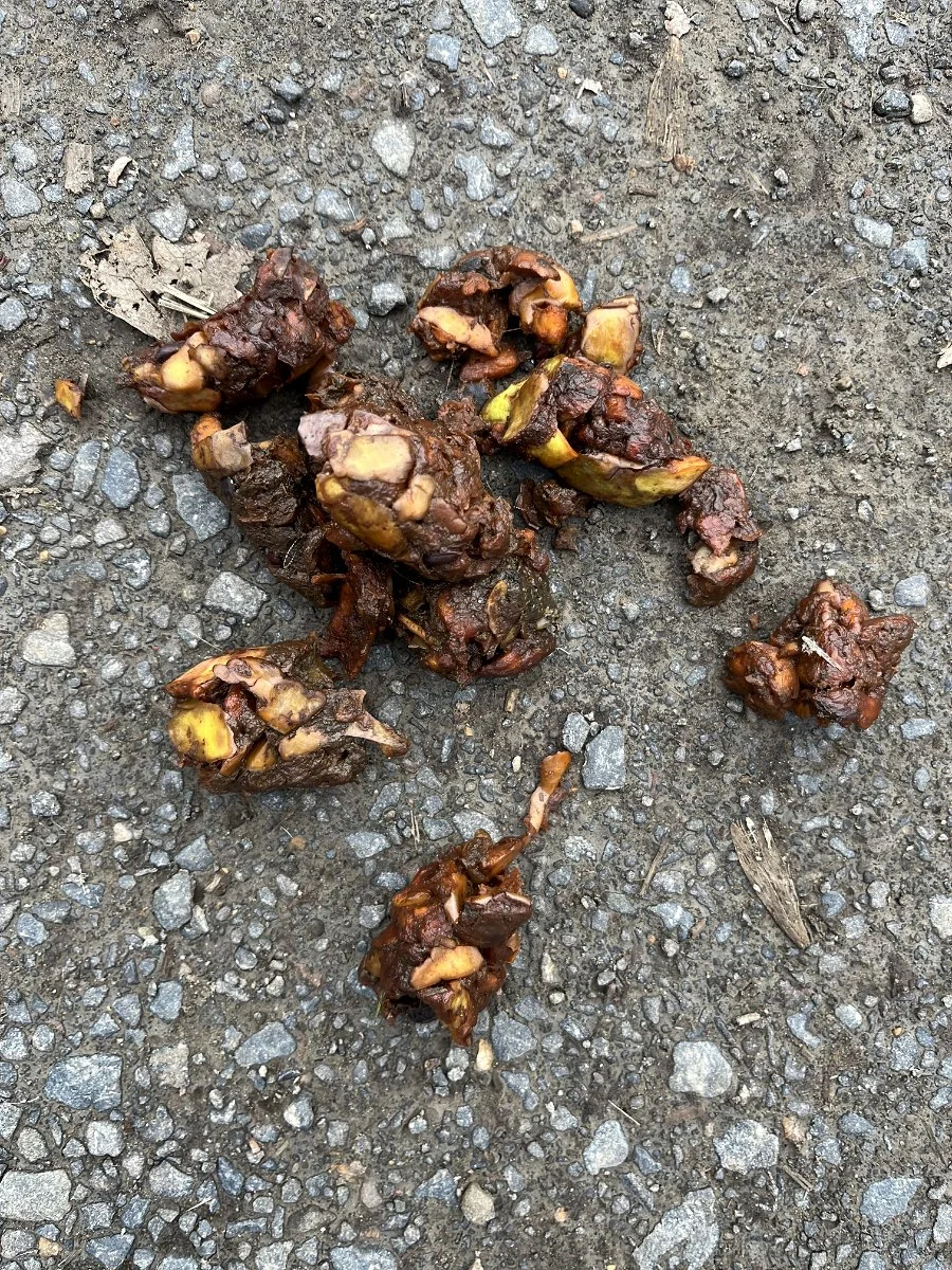 Coyote scat is frequently found on the trails at the arboretum. Like other canines, it defecates in conspicuous spots like trails, roads, prominent rocks, or other elevated spots such as fallen trees. The intentions of placing the scat in these locations is primarily to communicate to other coyotes and animals that this is its territory. Under the section on red foxes in his book Tracking and the Art of Seeing, Paul Rezendes says, “Most wild canines have anal scent glands and are actually depositing scent on scat. Some scientists believe that animals can identify other individuals from these scents.” Beyond establishing who you are and your territory, what information is being passed on to other coyotes and animals in these scents is not fully understood, as far as I can ascertain from the reading I have done so far.