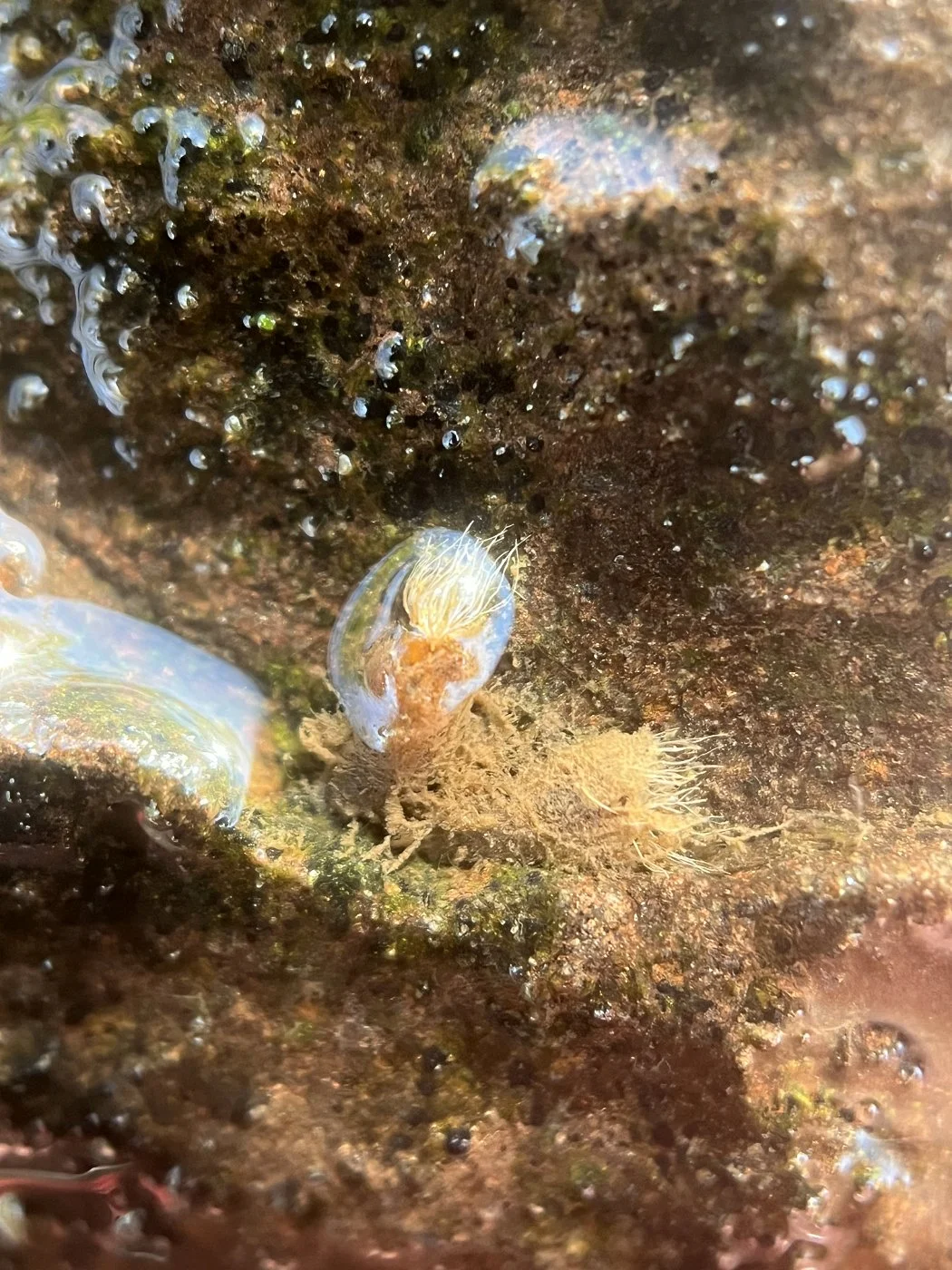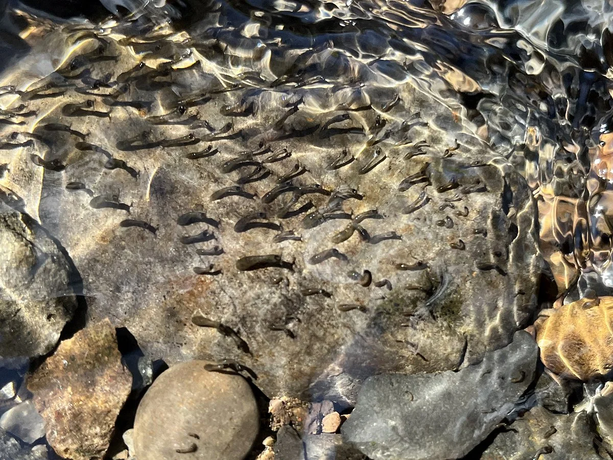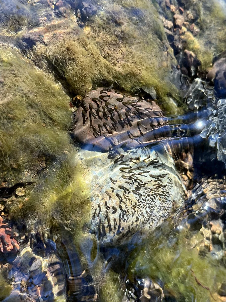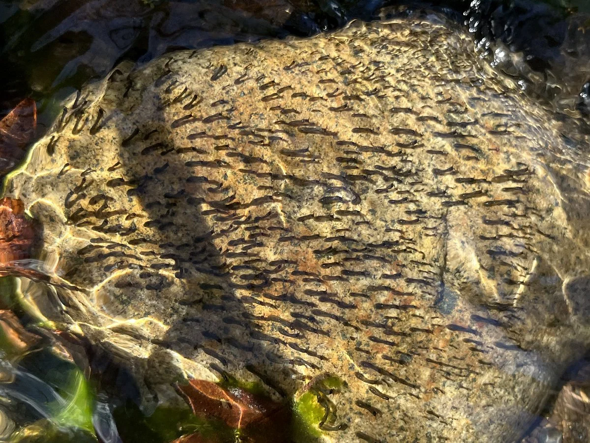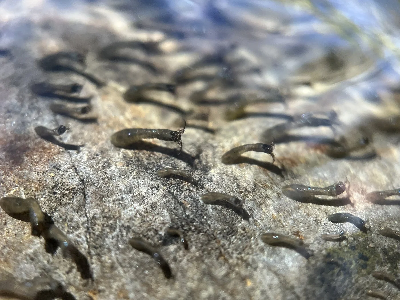 I tilted one on the rocks a little to try and get a better photo and their bodies quickly contracted and hugged the face of the rock for protection. Seeing that wasn’t going to work, I returned the rock, but the larvae were a little out of the flowing water. As I watched, some of them starting moving back over into the current. They grabbed onto the rock with their mouths, detached their abdomen, moved it over, and then reattached. They repeated this until they were back in a suitable spot.