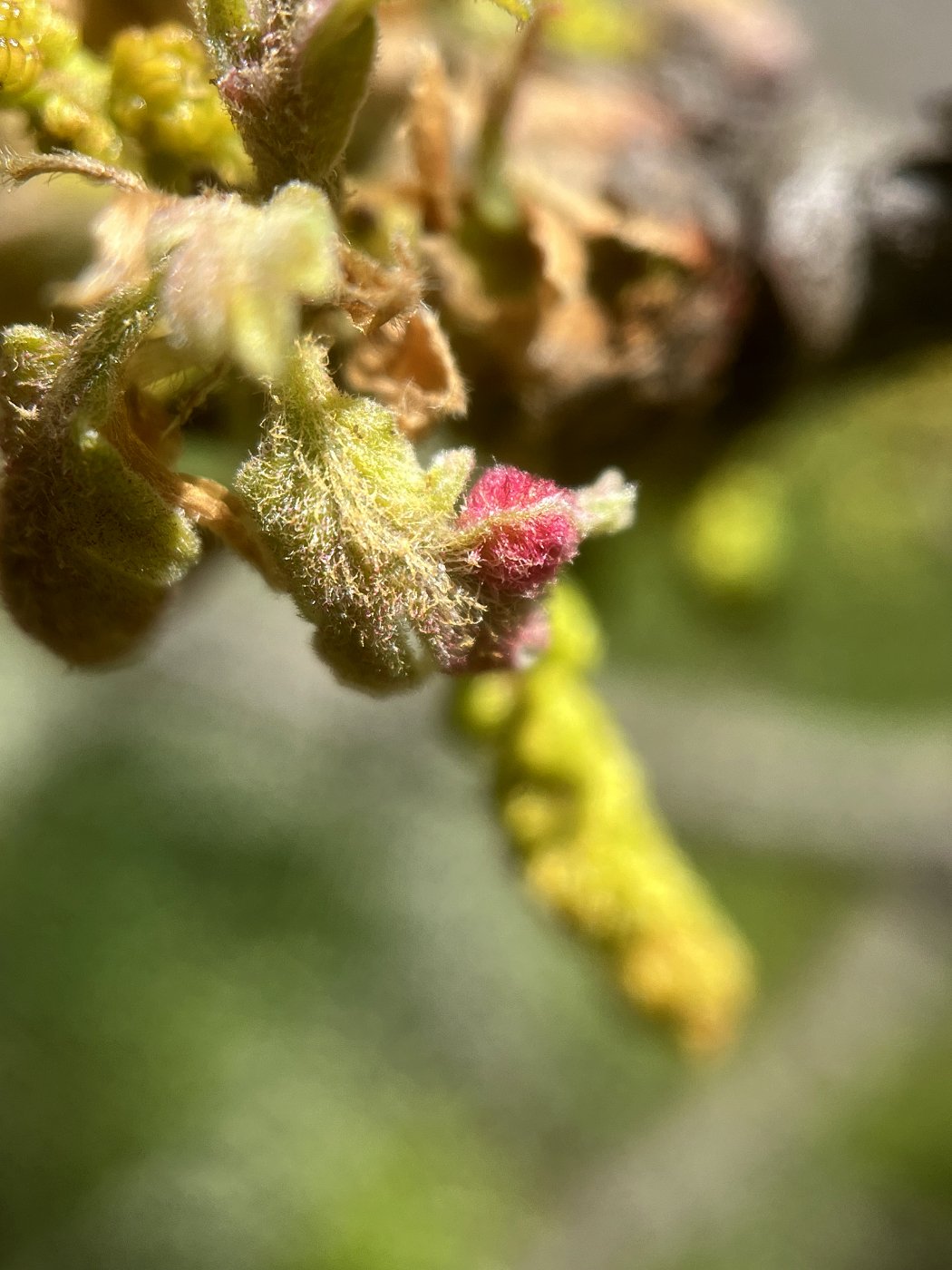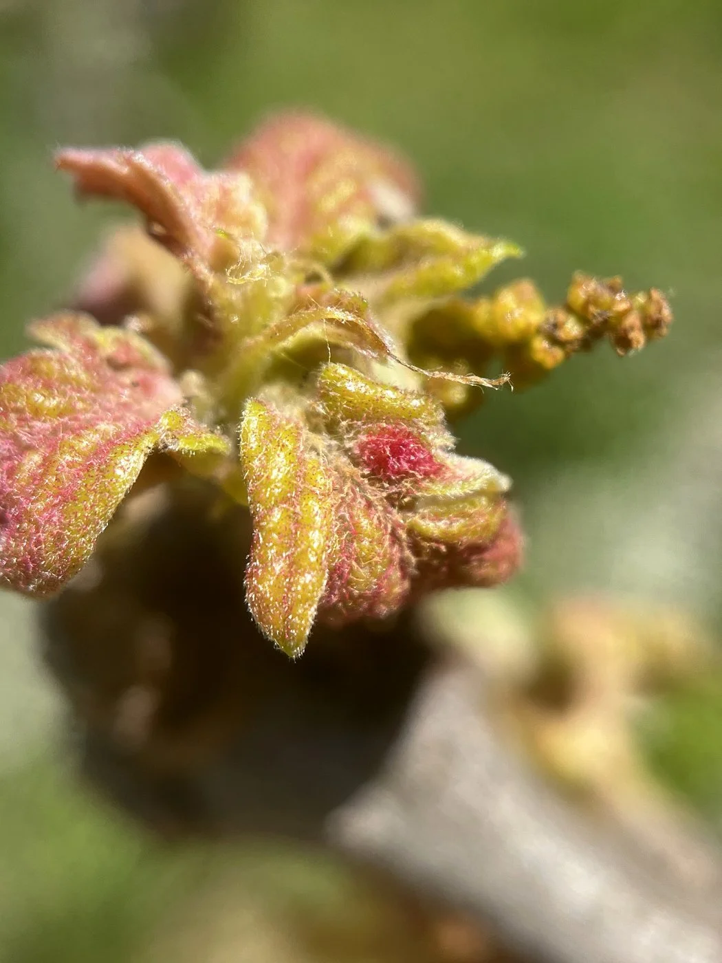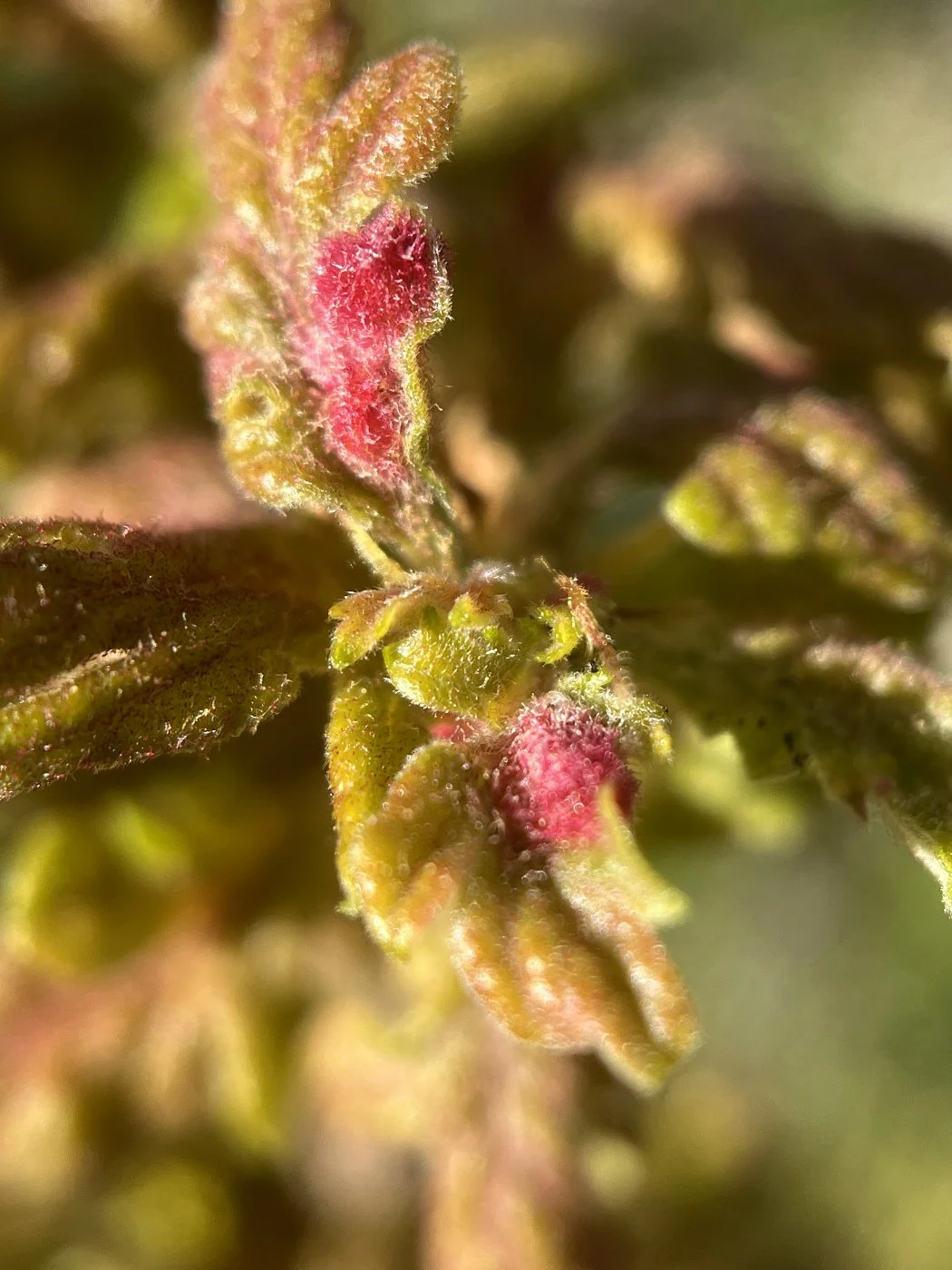 I’m back with an update on the fimbriate gall wasp. The leaves are emerging and there are fuzzy, bright crimson galls starting to form! I love the vibrant red color and as posted before, I want to add my own common name crimson comet gall for this gall.