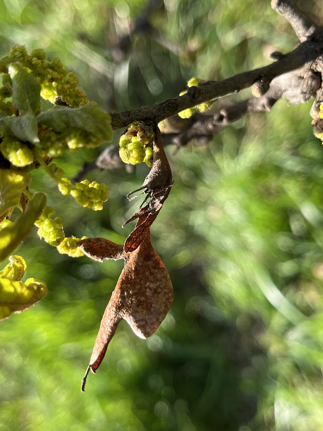 P.S. The last photo below shows an old leaf from last year that is still hanging on and it looks like it had a fimbriate gall on it.