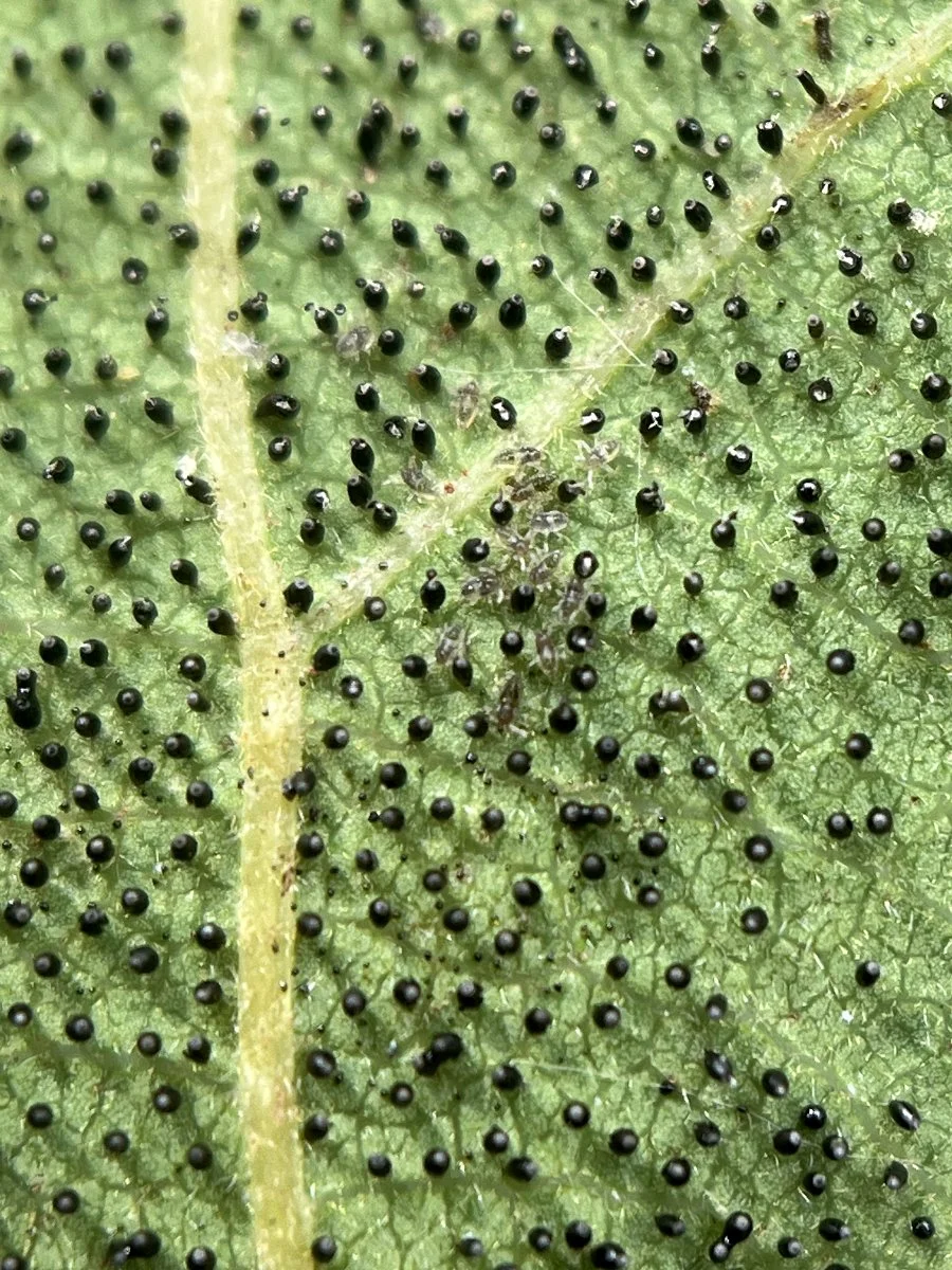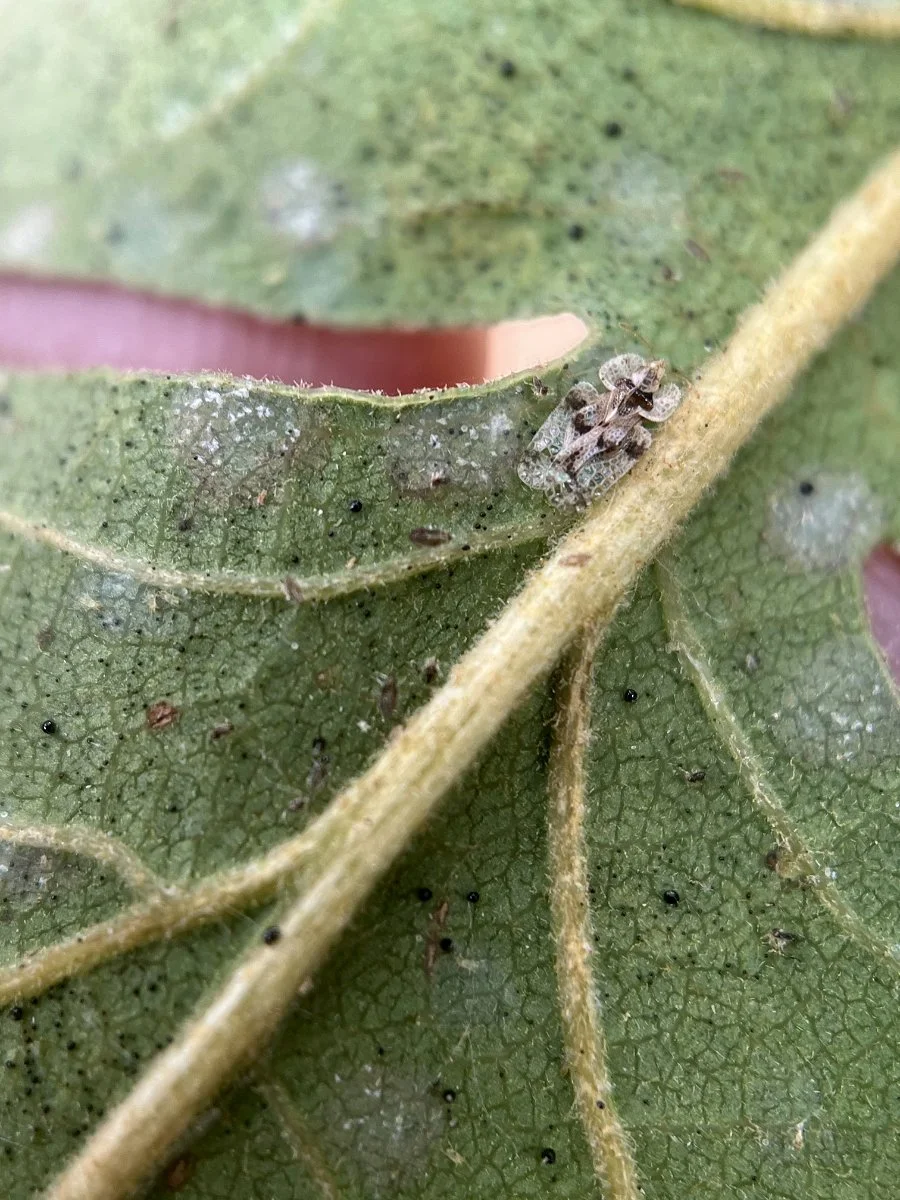 From my observations, the eggs are black and are fairly neatly laid in a small group. The excrement of the lace bugs is also black and it can be confusing to tell the difference when the leaf becomes infested and messy underneath. When the eggs hatch, the nymphs are black and spiny. Lace bugs will go through several instars before becoming adults. The adults have lace-like wings and it is where they get their common name.