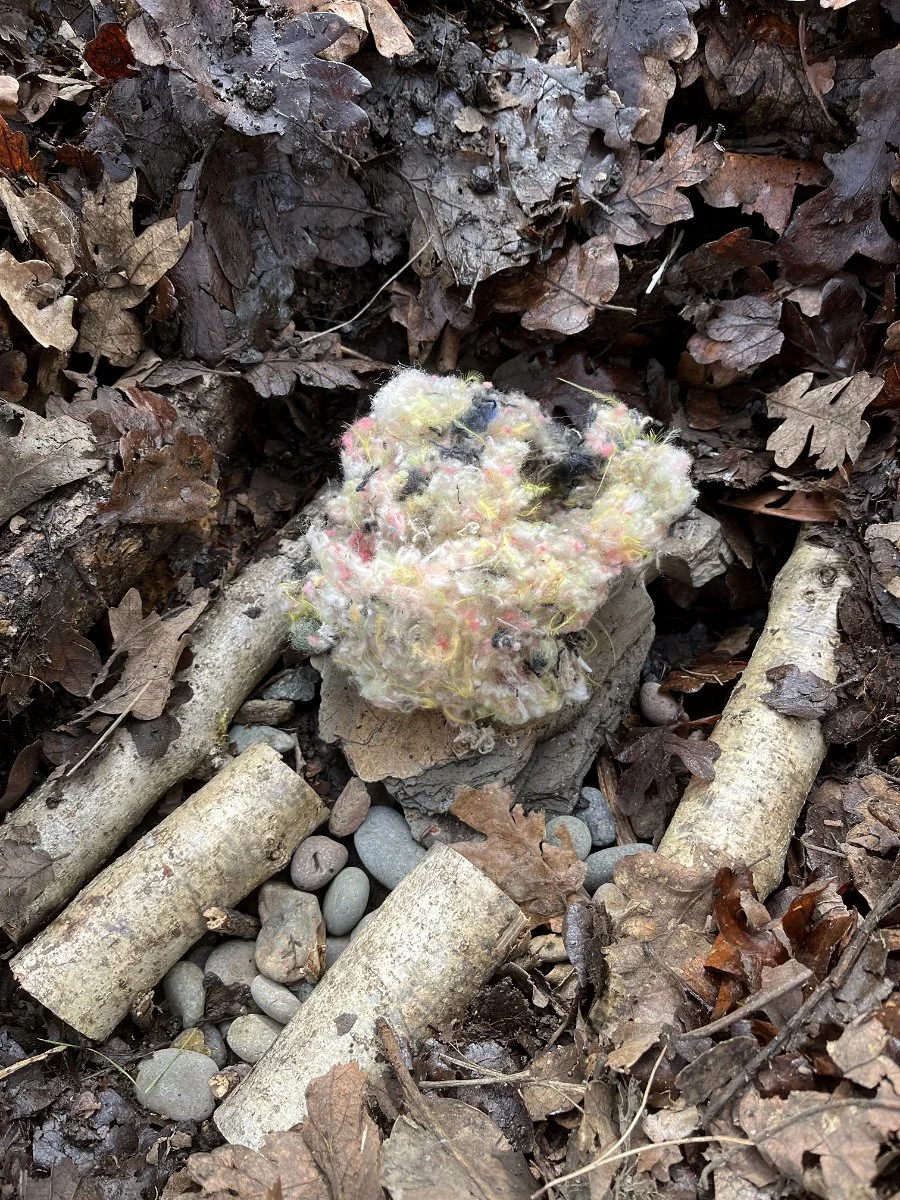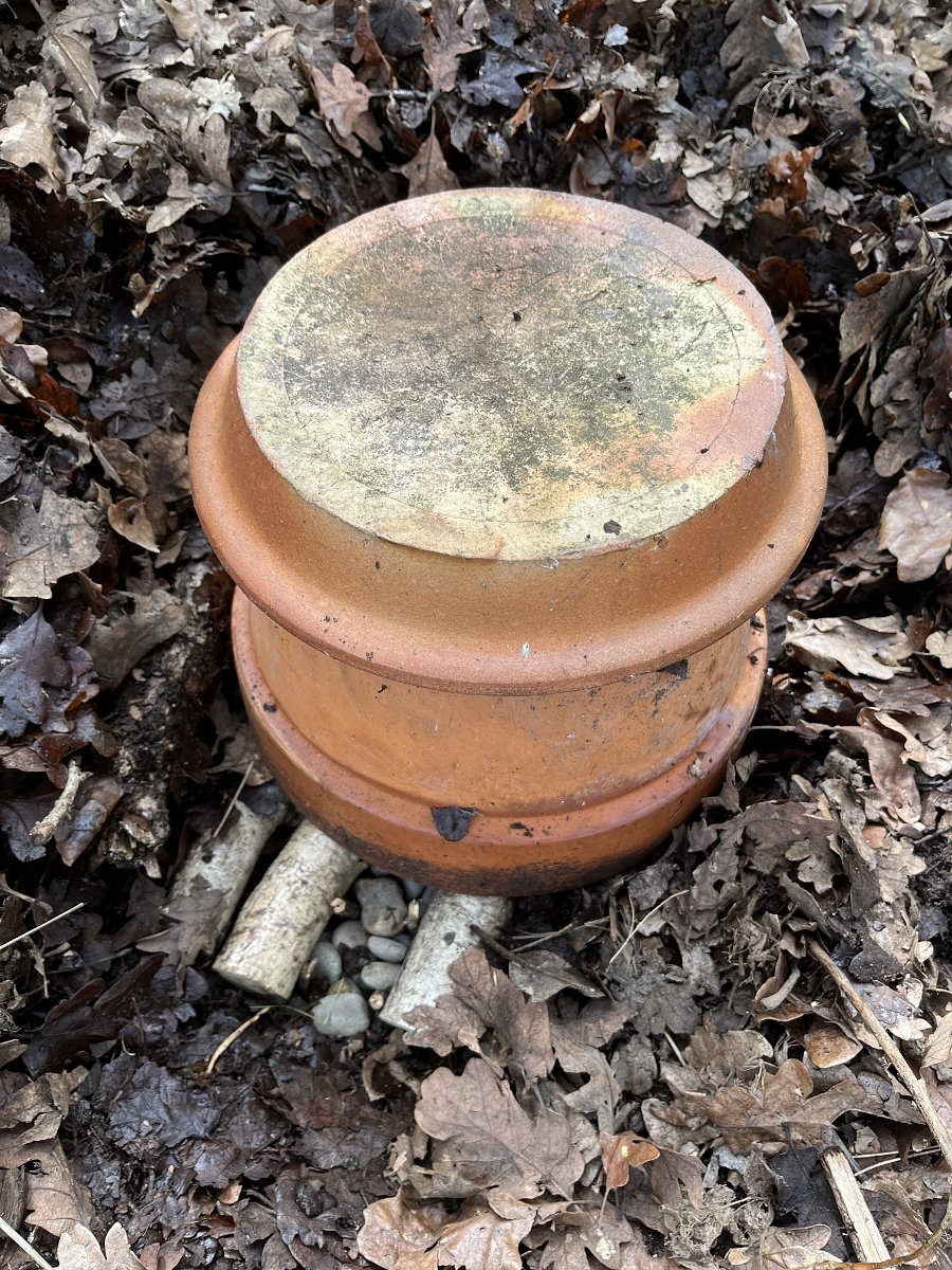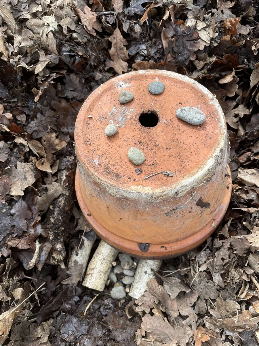 I cleared a small bit of ground and put some sticks down to form a base. Then I put a flat rock on top of that to act as a platform for a mouse nest. This will hopefully keep it off the ground to help it stay dry. Bumble bees are attracted to the scent of old rodent nests to start new colonies in the spring. The rodent burrow provides a dry cavity and the old nest provides insulation to help the queen keep the new hive warm. I put a flower pot on top to act as the cavity. I added some some rocks on top to slightly elevate the lid so the drain hole in the bottom of the flower pot can allow for some ventilation. I created a small entrance with a few branches and put some rocks in between as a porch for bees to land on. I covered the pot with leaves and put some old pieces of wood in the front as a small roof for the entrance.
